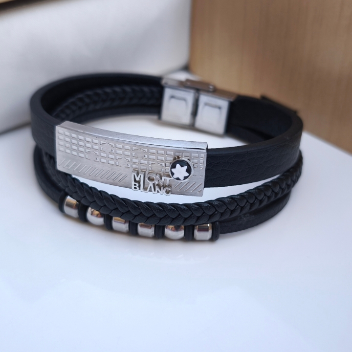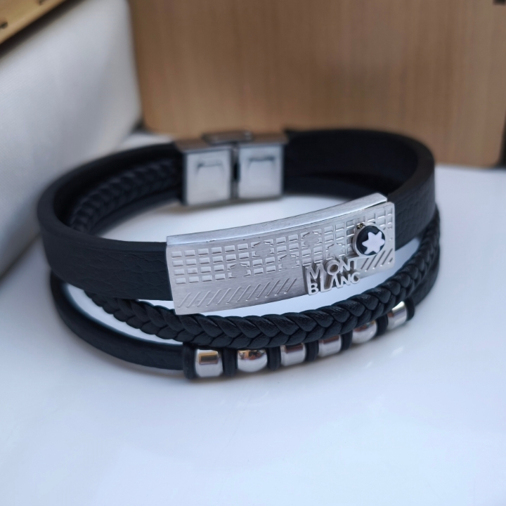 دستبند مردانه چرمی مشکی مونت بلانک پهن