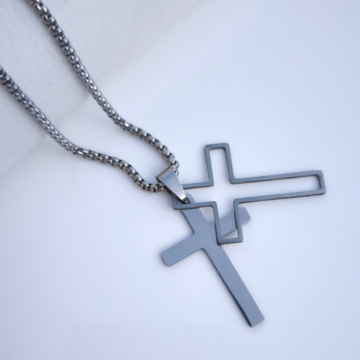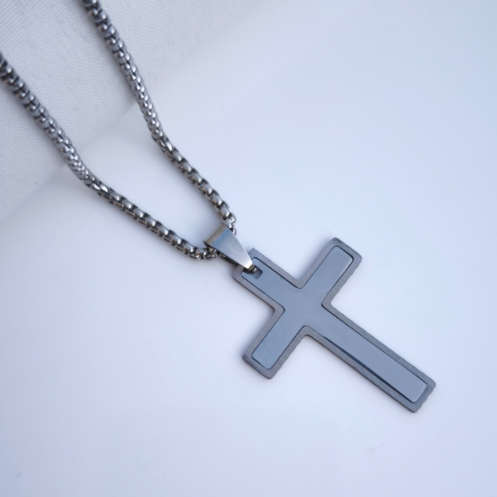 گردنبند صلیب دو تیکه نقره ای استیل همراه زنجیر ویتالی
