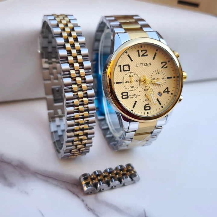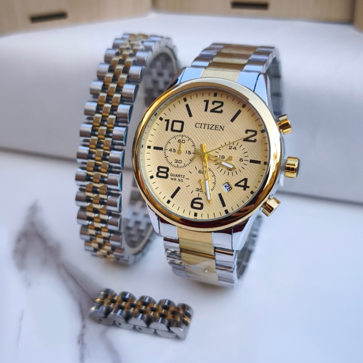 ست ساعت دستبند انگشتر مردانه نقره ای طلایی استیل سیتیزن