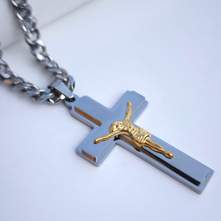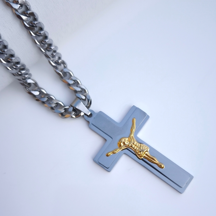 ترکیب رنگ نقرهای این گردنبند مردانه باعث شده بهراحتی با انواع استایل اسپرت یا رسمی ست بشه. پلاک صلیب بزرگ با طراحی خاص، روی زنجیر مردانه کارتیر استیل رنگ ثابت قرار گرفته و جلوهای شیک و متمایزی بهت میده.