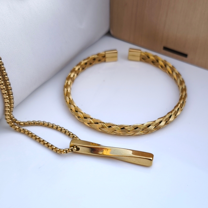 ست گردنبند و بنگل پسرانه استیل طلایی