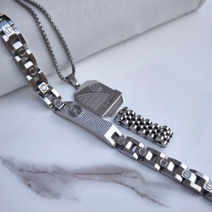 این ست لوکس مردانه از برند کارتیر ، ترکیبی بینظیر از طراحی مدرن و کیفیت بالا است. ساختهشده از استیل ضد زنگ با رنگ ثابت ، در برابر رطوبت، تعریق و شستشو مقاوم بوده و درخشش خود را حفظ میکند.