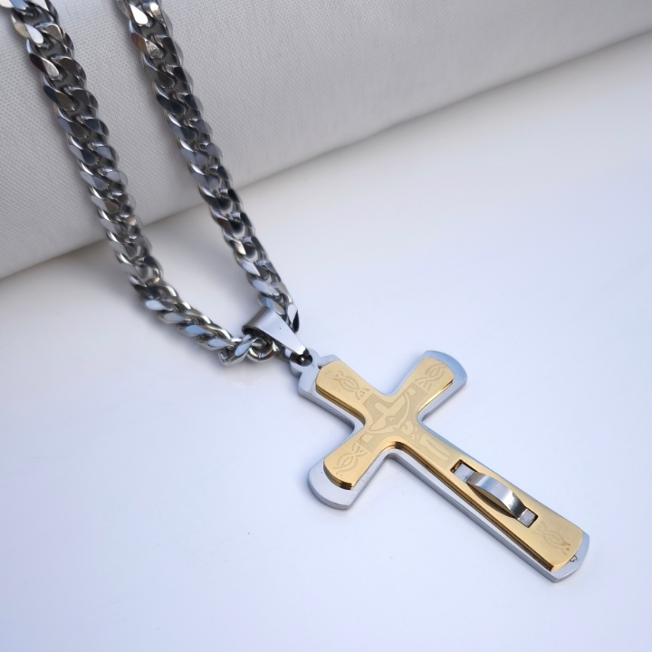 ترکیب رنگ نقرهای این گردنبند مردانه باعث شده بهراحتی با انواع استایل اسپرت یا رسمی ست بشه. پلاک صلیب بزرگ طلایی نقره ای با طراحی خاص، روی زنجیر مردانه کارتیر استیل رنگ ثابت قرار گرفته و جلوهای شیک و متمایزی بهت میده.