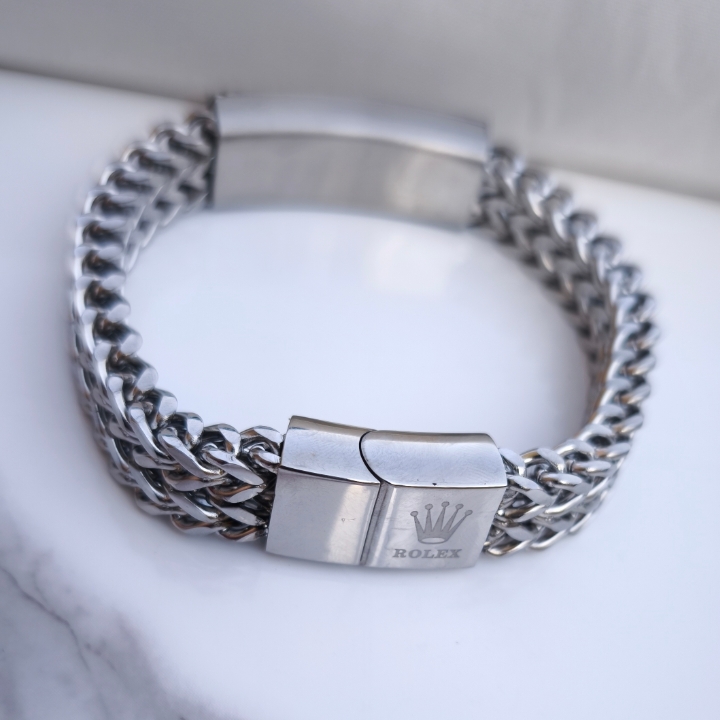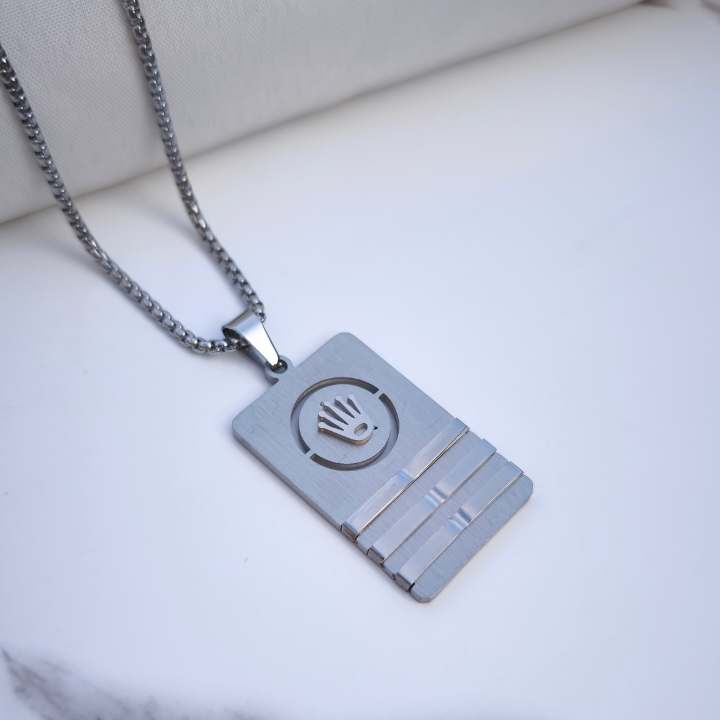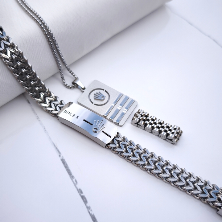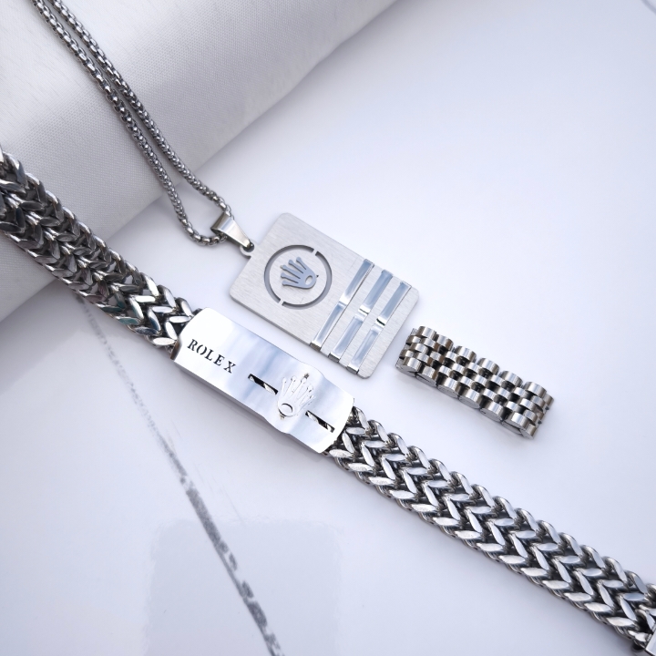 ست دستبند گردنبند انگشتر مردانه رولکس استیل رنگ ثابت نقره ای