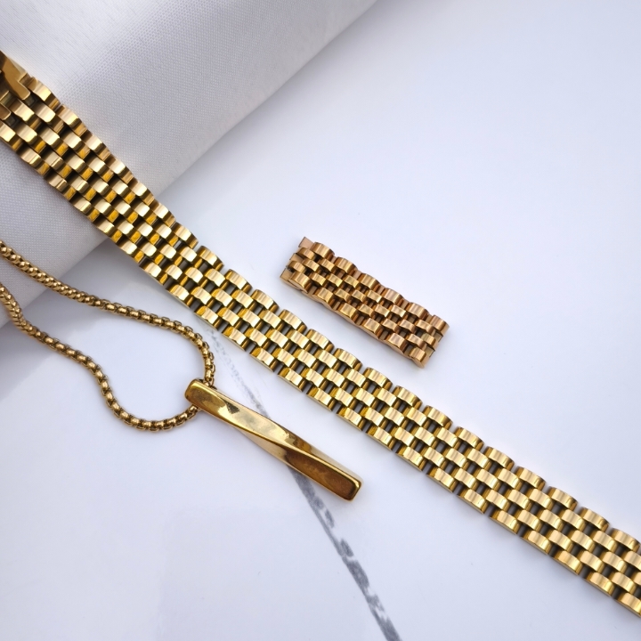 ست گردنبند دستبند و انگشتر مردانه رولکس استیل رنگ ثابت طلایی