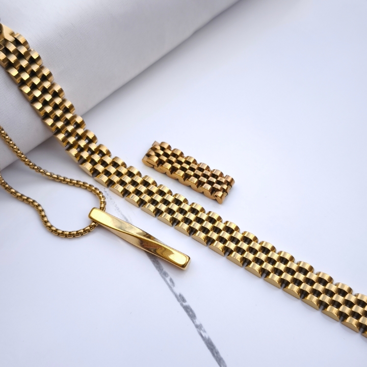ست گردنبند دستبند انگشتر طلایی مردانه رولکس استیل